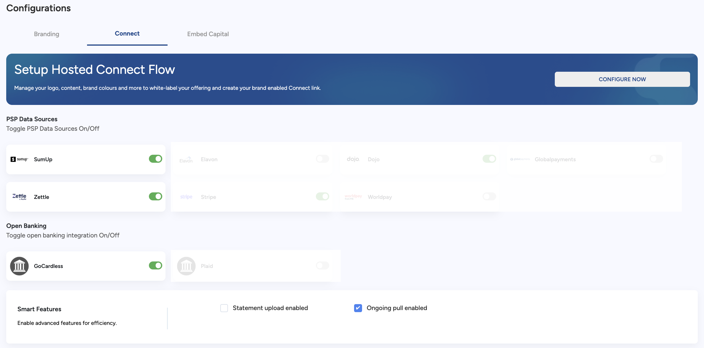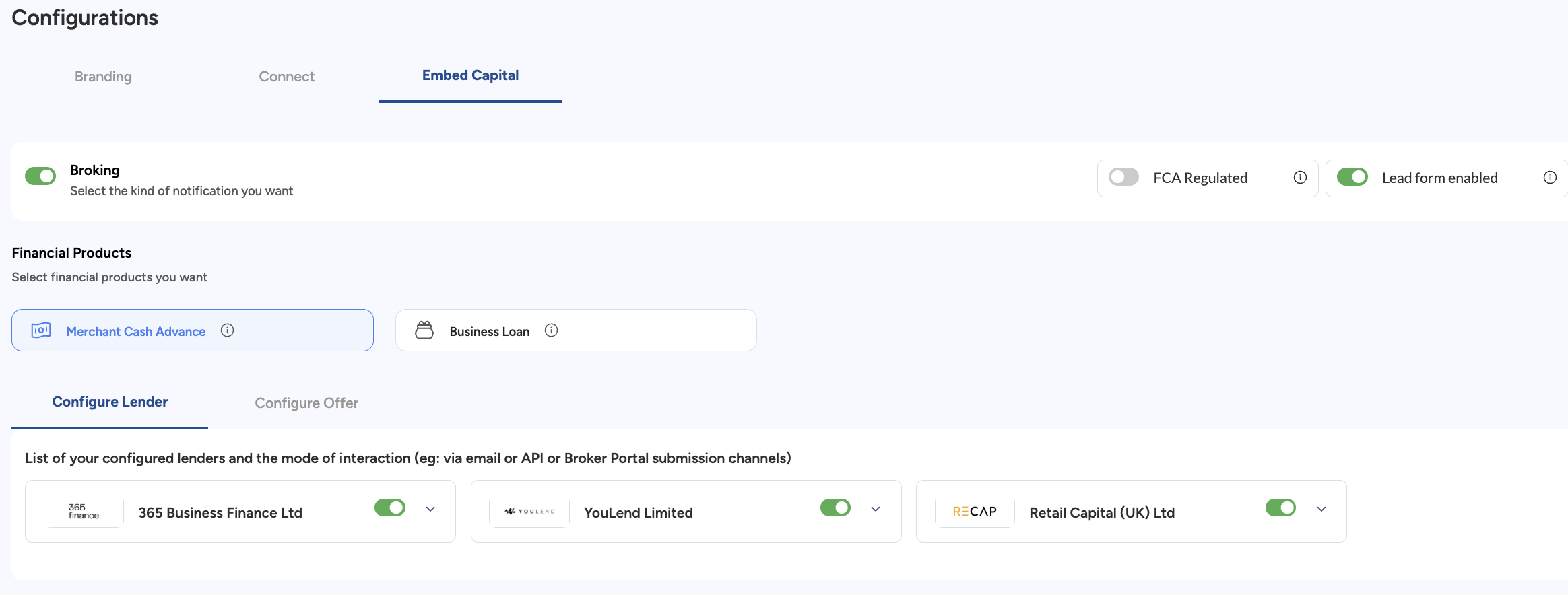 You can view your pre-configured lending/capital products (MCA - Merchant Cash Advance; Business/Term Loans) and providers as follows via the Configurations menu option on Portal.