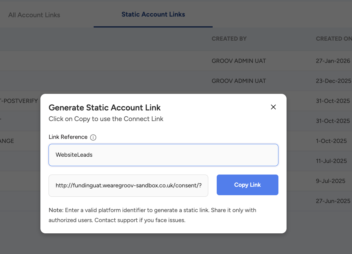 - Generate a one-off static link using the 'Generate Static Account Link' CTA button from the Account Links dashboard menubar option. A snapshot below shows how it looks.